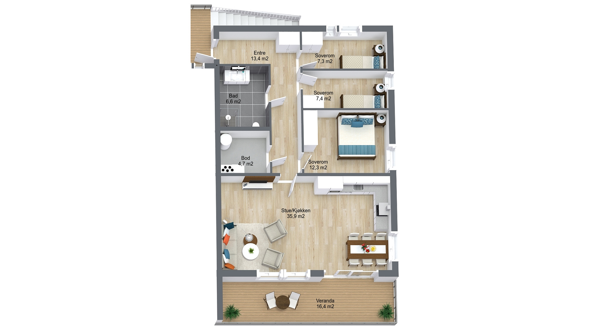 Bustaden inneheld stove/kjøkken, tre soverom, bad, entré, bod, balkong, sportsbod og overbygd parkeringsplass. I området er det tilgang til gjesteparkering og flotte leikeplassar, med m.a. leikeapparat og benk.